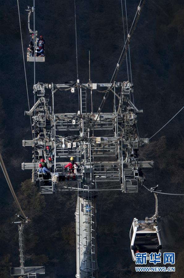 华山太华索道维修人员对索道支架及钢丝绳进行检测(12月6日摄)。新华社记者陶明摄