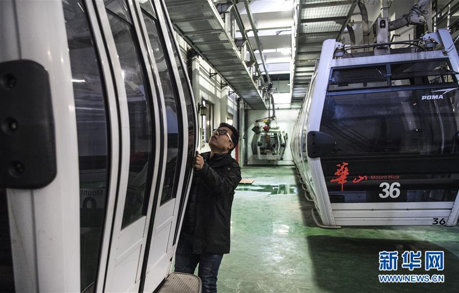 华山太华索道检修人员在检查吊厢门开关(12月6日摄)。新华社记者陶明摄