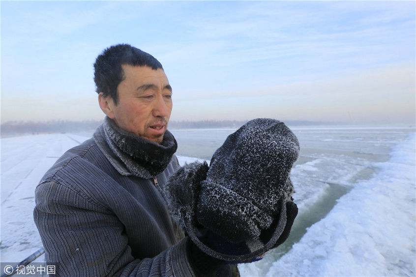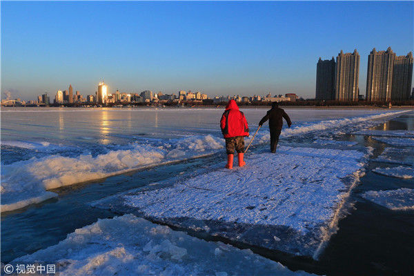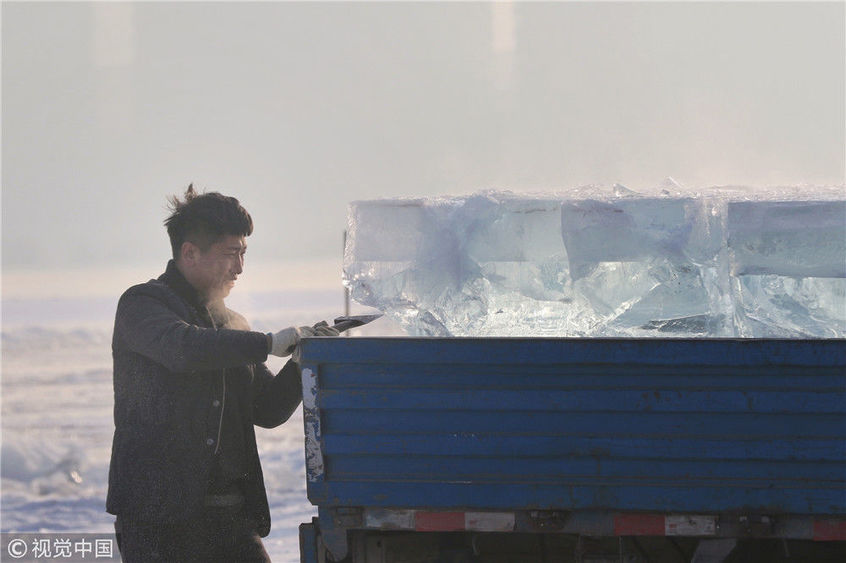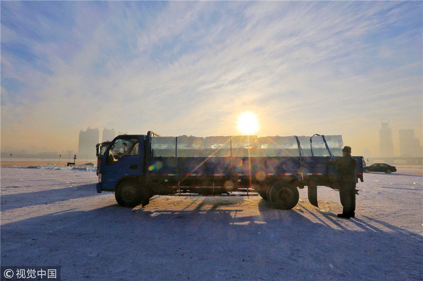 2018年12月8日,最低气温零下22度,哈尔滨市江北公路大桥东侧的江面上,工人们正在从江中捞取冰块,装车运往景区制作冰灯、冰雕。现场,工人先是用电锯、铁钎将冰分割成半米多宽,一米多长的冰块,接着将其拉出水面。等候在旁的叉车上前,将冰装上运冰的卡车,之后装满冰块的卡车驶往景区。