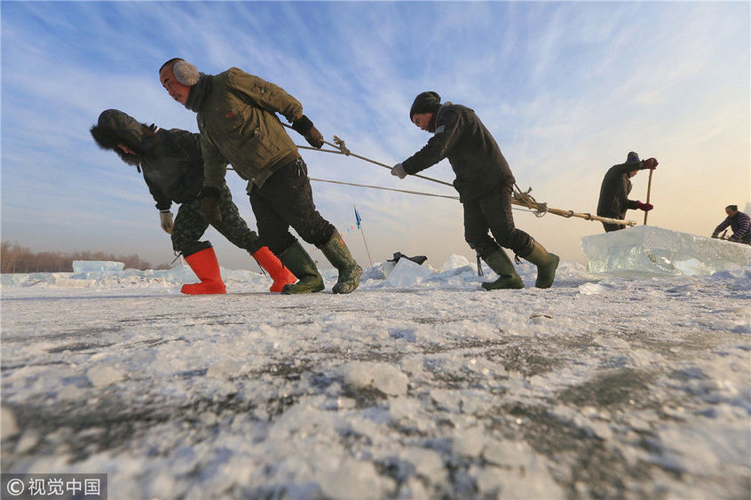 2018年12月11日,黑龙江省哈尔滨市,松花江上,采冰者们弯腰拉绳,宛如纤夫般拽重达半吨的冰块出水。采冰者都是自哈市江北万宝、东发、沙陀子等乡镇的农民,他们每年冬闲时都会亲属、村邻之间结伴到松花江畔采冰,有的采冰人,已经连续干了二十多年。每个采冰季,他们每天要在冰面上工作10-12个小时,每个采冰组,一天要拽出冰块2000-3000块,一个近20天的采冰季,每人能收入近万元。视觉中国
