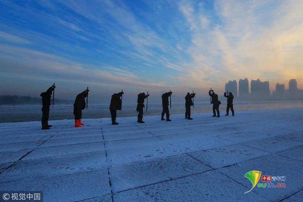 中国青年网2018年12月13日讯2018年12月11日,黑龙江省哈尔滨市,松花江上,采冰人在漫天霞光中破冰、采冰,金色光芒在水雾上升腾缭绕,给劳动的场面增添了诗意。