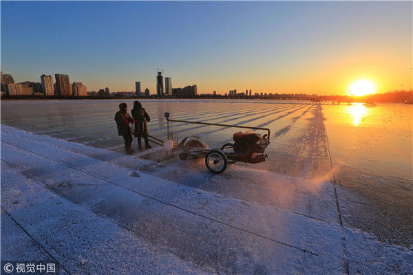 2018年12月08日,黑龙江省哈尔滨市,松花江采冰,今日正式出冰。本次采冰,是为第二十届哈尔滨冰雪大世界的建造而进行。视觉中国