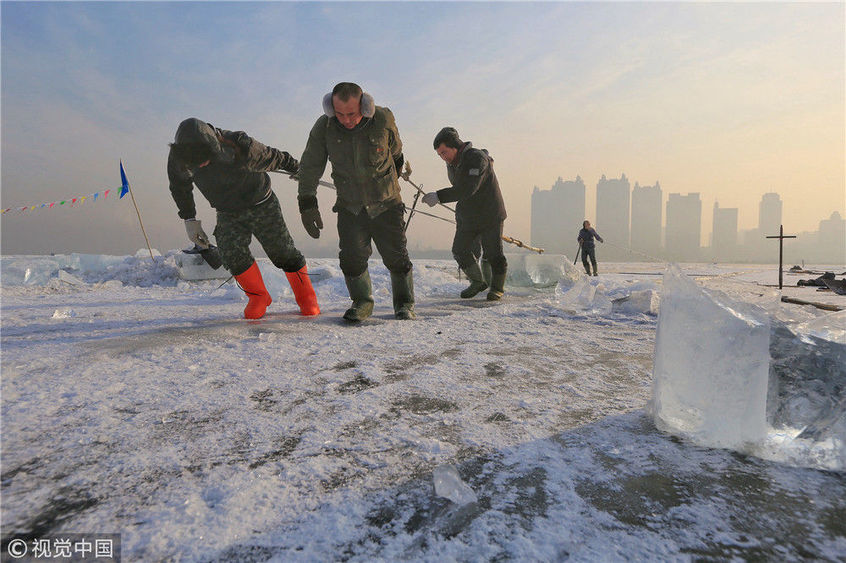 2018年12月11日,黑龙江省哈尔滨市,松花江上,采冰者们弯腰拉绳,宛如纤夫般拽重达半吨的冰块出水。采冰者都是自哈市江北万宝、东发、沙陀子等乡镇的农民,他们每年冬闲时都会亲属、村邻之间结伴到松花江畔采冰,有的采冰人,已经连续干了二十多年。每个采冰季,他们每天要在冰面上工作10-12个小时,每个采冰组,一天要拽出冰块2000-3000块,一个近20天的采冰季,每人能收入近万元。