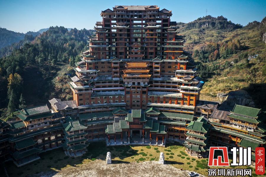2019年12月8日,贵州省黔南布衣族自治州。位于独山县影山镇净心谷的水司府堂占地面积5900平方米,总建筑面积60000平方米,共24层,高99米,进深240米,是世界上最高最大最壮观的水族建筑,被称为“天下第一水司楼”。