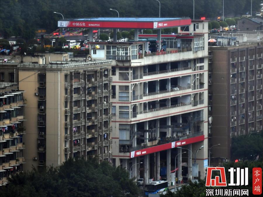 2019年11月24日,重庆渝中区,一栋大楼的一楼是加油站,六楼楼顶还是加油站,让人称奇。