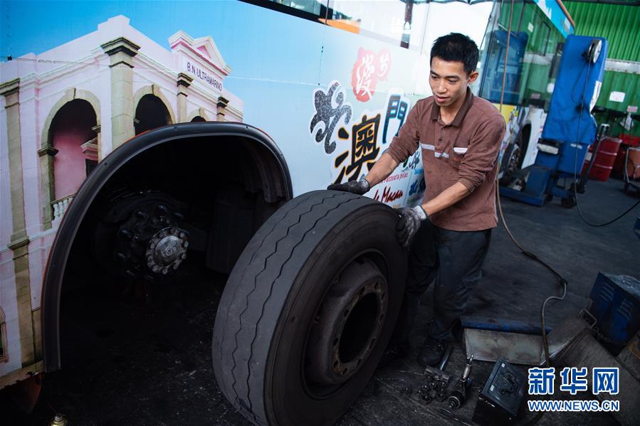 11月26日,澳门公共汽车股份有限公司郑家松在推轮胎,他已经工作了2年,主要负责为公交车做定期保养及维修。 新华社记者 张金加 摄