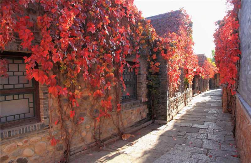 2019年10月30日,北京,古北水镇秋色正浓,随处可见的爬山虎蔓茎纵横,叶子正红,将水镇变成了红叶小镇,美如画卷。