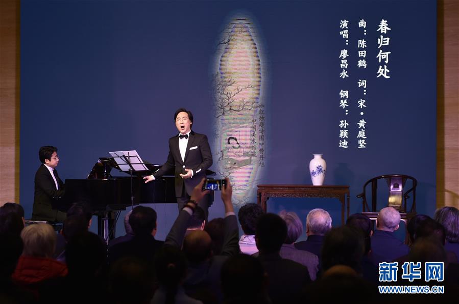 12月10日晚,廖昌永在音乐会上演唱《春归何处》。 当晚,中国古典诗词与书画——廖昌永中国艺术歌曲独唱音乐会在北京中国美术馆举行。 新华社记者 鲁鹏 摄