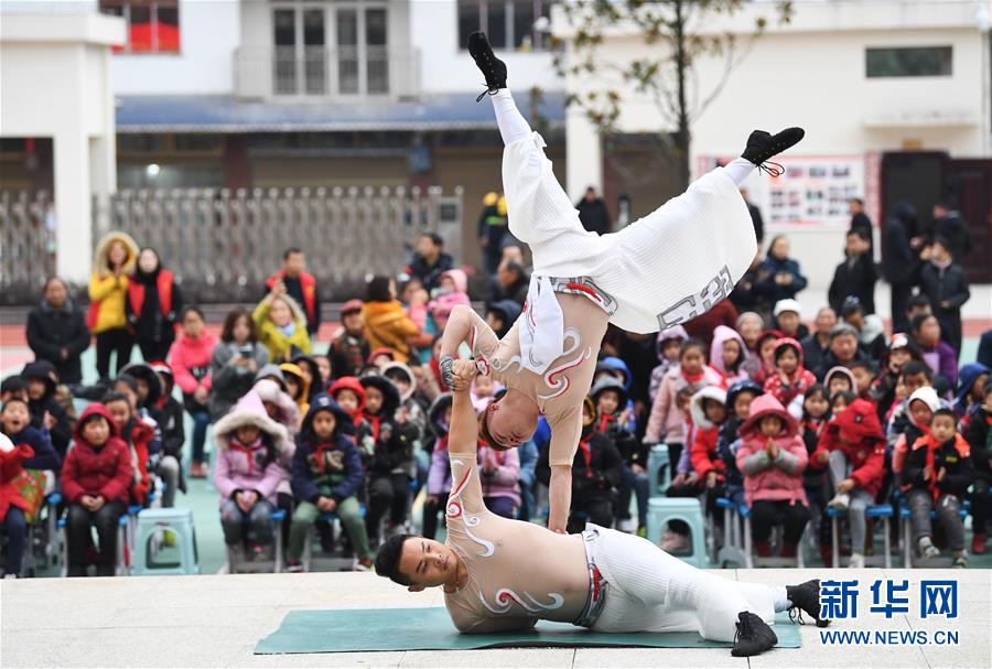 12月12日,文艺志愿者在中益乡小学表演杂技《中国力量》。