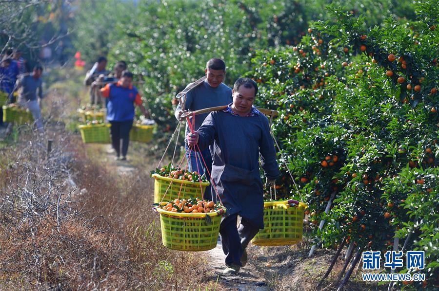 12月11日,广西柳州市鹿寨县四排镇四排村村民在果园里挑运砂糖橘。新华社记者 黄孝邦 摄