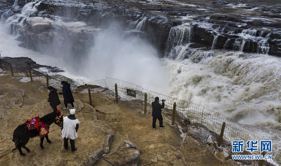 12月14日,游人在壶口瀑布景区游玩(无人机拍摄)。 新华社记者 陶明 摄