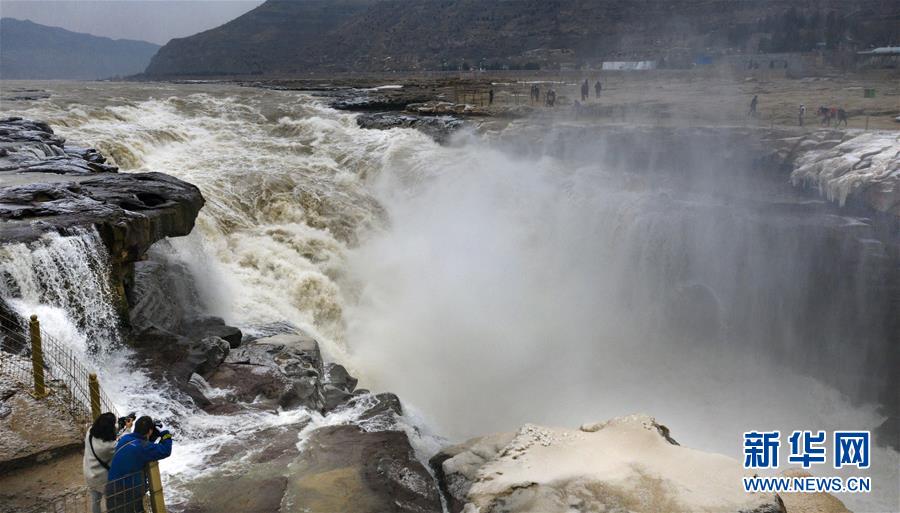 12月14日,游人在壶口瀑布景区拍照(无人机拍摄)。 新华社记者 陶明 摄