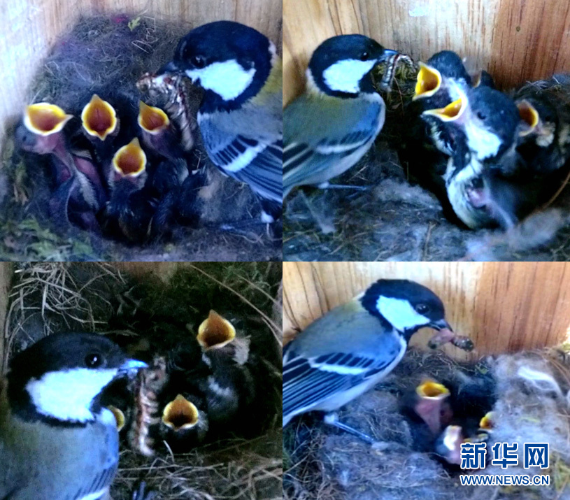 拼版照片:罗康在人工巢箱里安装的录像设备拍摄到鸟类在以松毛虫喂食幼鸟(资料照片)。 新华社发