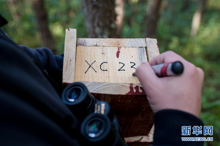 罗康在新做好的人工鸟巢底部写下编号(12月12日摄)。 新华社记者 胡超 摄