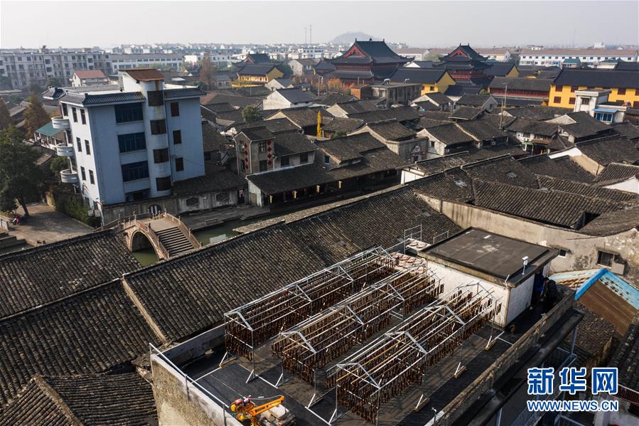 12月3日,安昌古镇传统腊味作坊里晒满了各种手工制作的绍兴腊味(无人机拍摄)。新华社记者徐昱摄