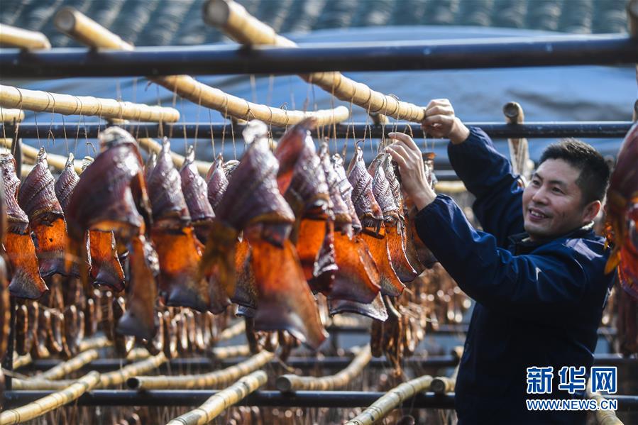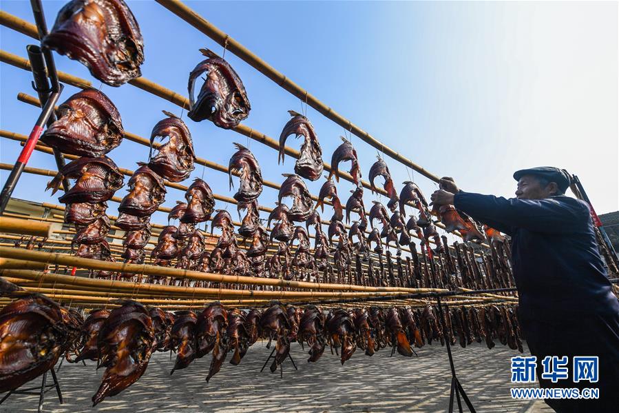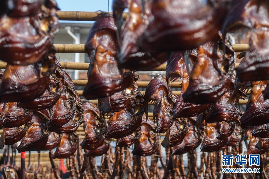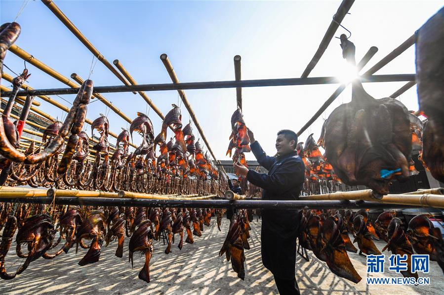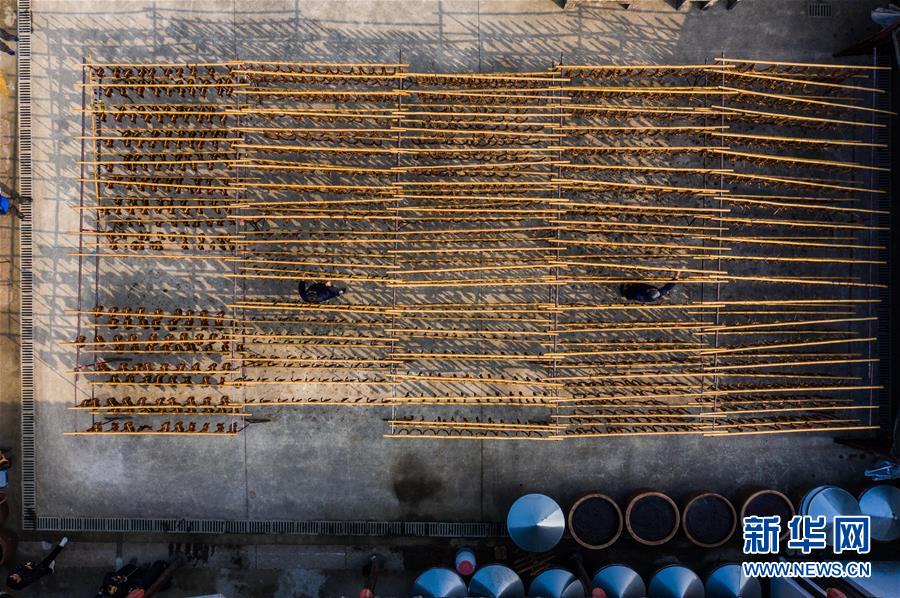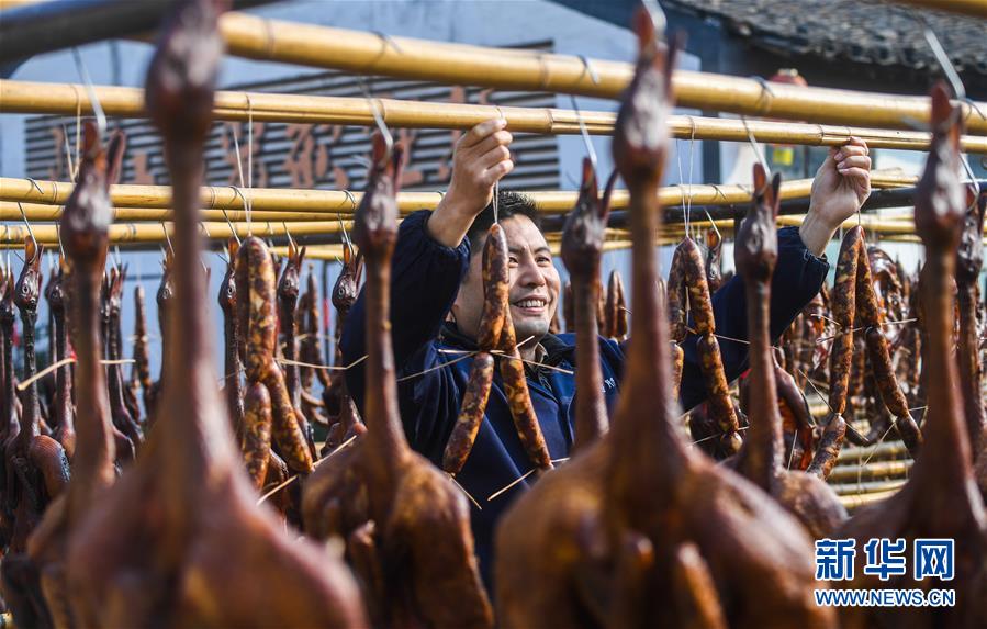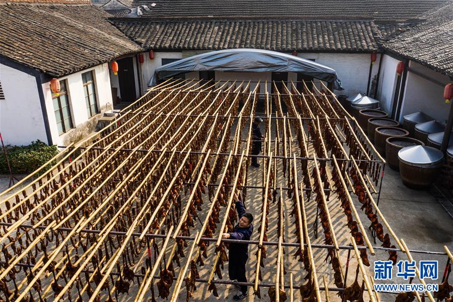 初冬时节,浙江省绍兴市柯桥区安昌古镇开启了传统腊味制作、上市的季节。当地百姓用传统酱油、黄酒、香料等手工腌制腊肠、酱鸭、鱼干、酱鹌鹑、酱排骨等绍兴特色酱货,在冬季的阳光下进行晾晒,满街飘香的腊味也成了这座江南古镇的独特风景。安昌古镇是浙江省历史文化名镇,有着一千多年历史,比较完善地保存了古吴越地区沿袭千百年来的民俗风情。每年大雪节气前后,安昌当地百姓按照传统习俗挑选晴朗好天气制作、晾晒传统酱货,各类酱货颜色黑红油亮,咸鲜适口,是当地冬季的特色传统美食。新华社记者徐昱摄