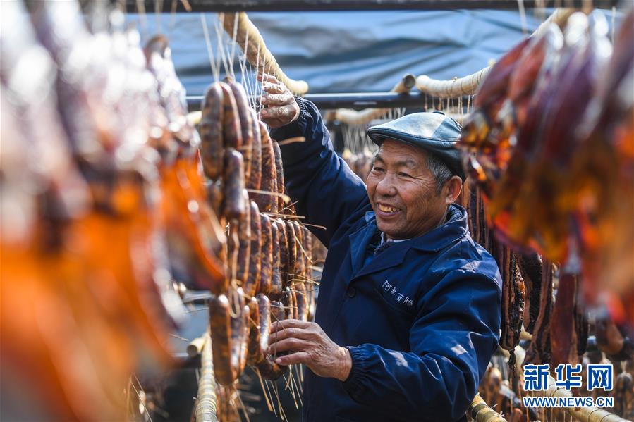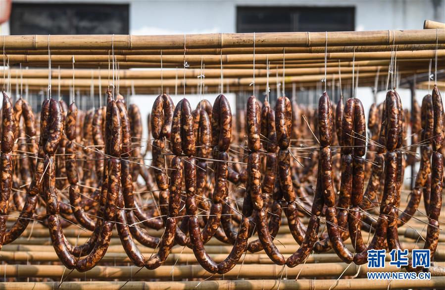 12月3日,安昌古镇一家名为阿红香肠的传统腊味作坊里的工作人员在晾晒各种手工制作的绍兴腊味。新华社记者徐昱摄
