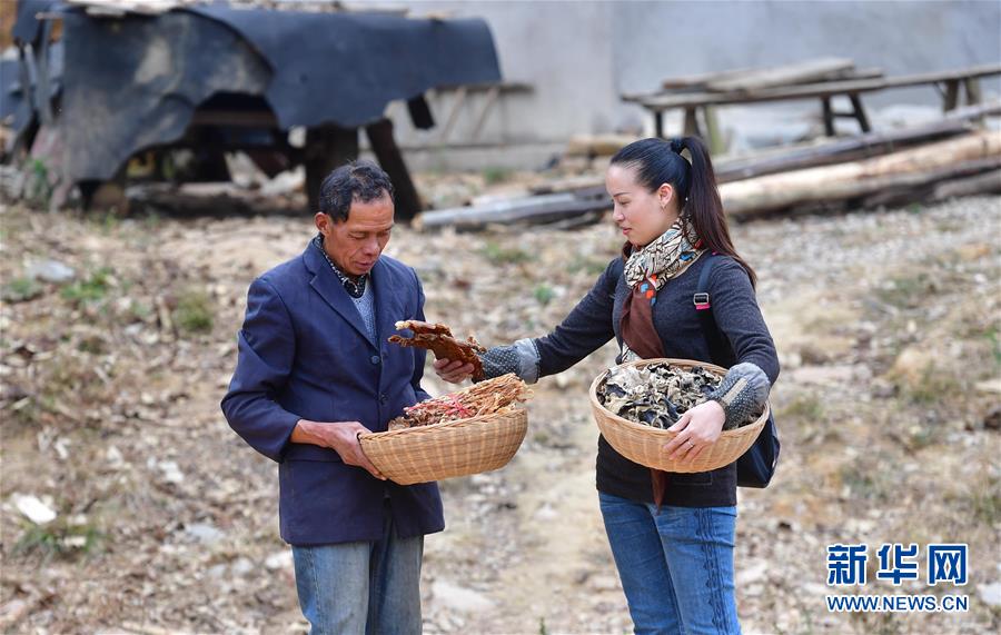 在鹿寨县拉沟乡木龙村,李柳萍(右)到五保户李建文家收购木耳、干笋等(12月14日摄)。新华社记者黄孝邦摄