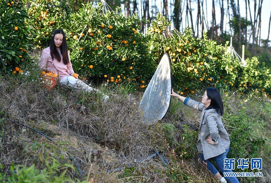 李柳萍(左)和员工在果园里拍摄鹿寨蜜橙宣传片(12月9日摄)。新华社记者黄孝邦摄