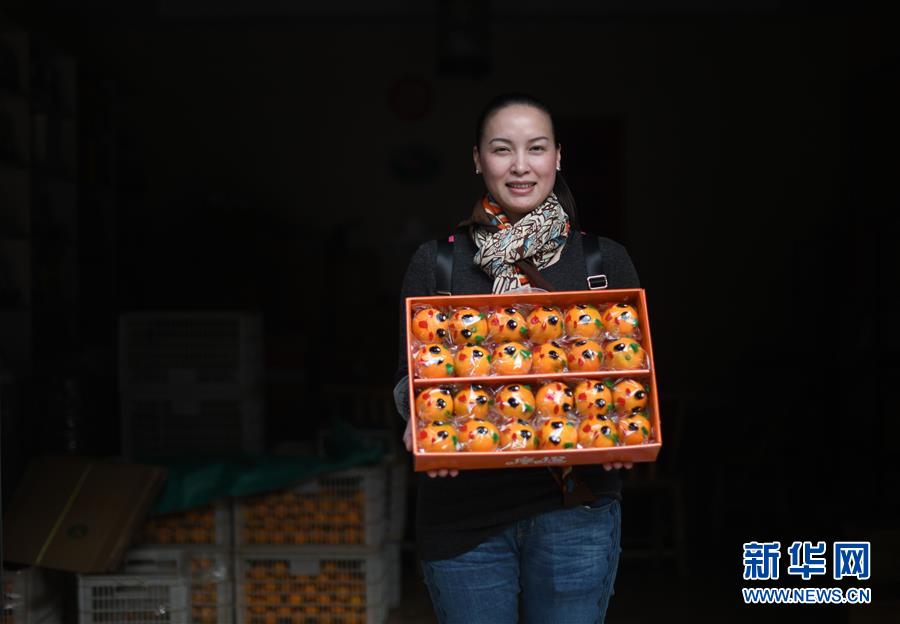 李柳萍在特产馆里展示包装好的鹿寨蜜橙(12月14日摄)。新华社记者黄孝邦摄