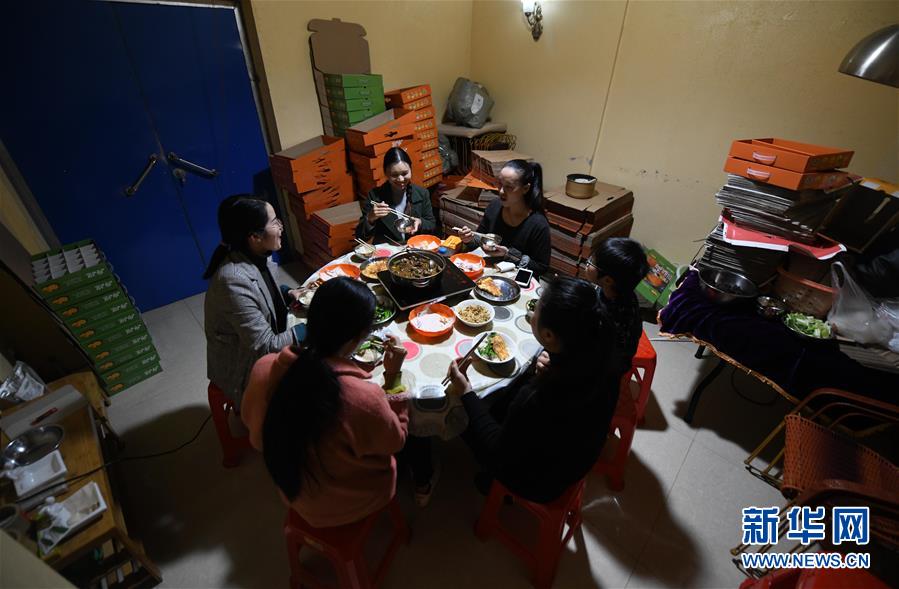 李柳萍(后排右一)在特产馆里和员工吃晚饭(12月14日摄)。新华社记者黄孝邦摄