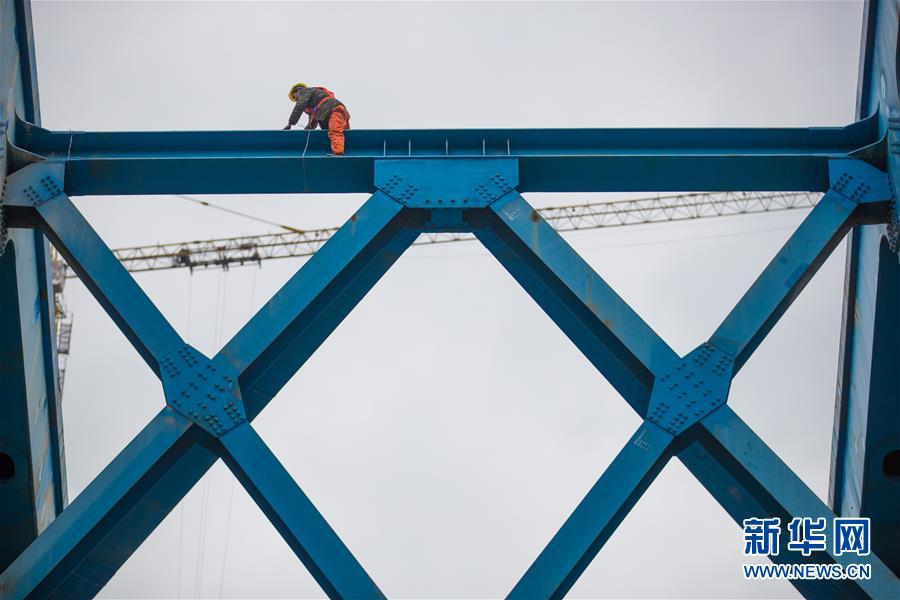 3月14日,施工人员在鸭池河特大桥上拆除辅助设施。新华社记者刘续摄