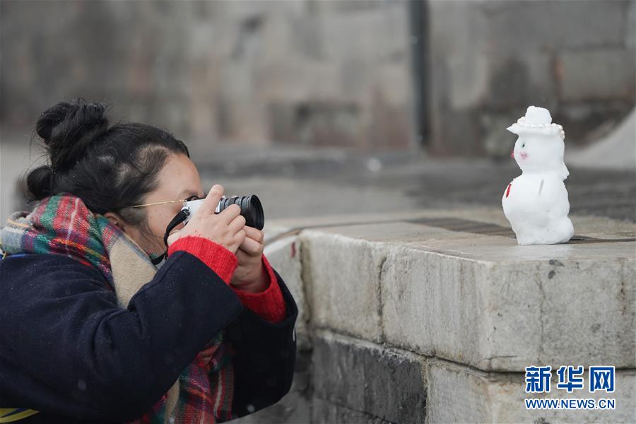 12月16日,在北京天坛公园,一名女士拍摄小雪人。当日,北京迎来降雪天气。新华社记者鞠焕宗摄