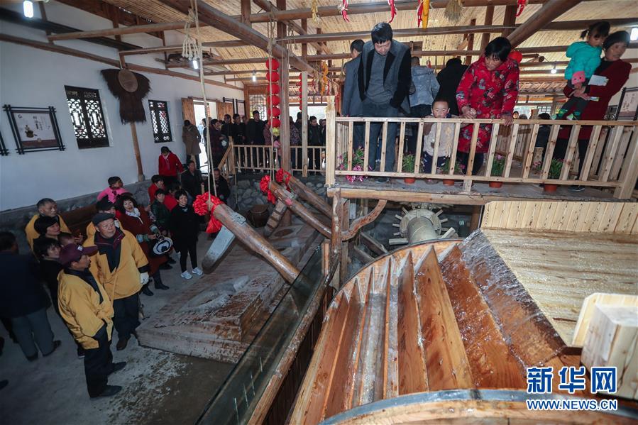 12月15日,游客在老油坊内观看古法榨油。