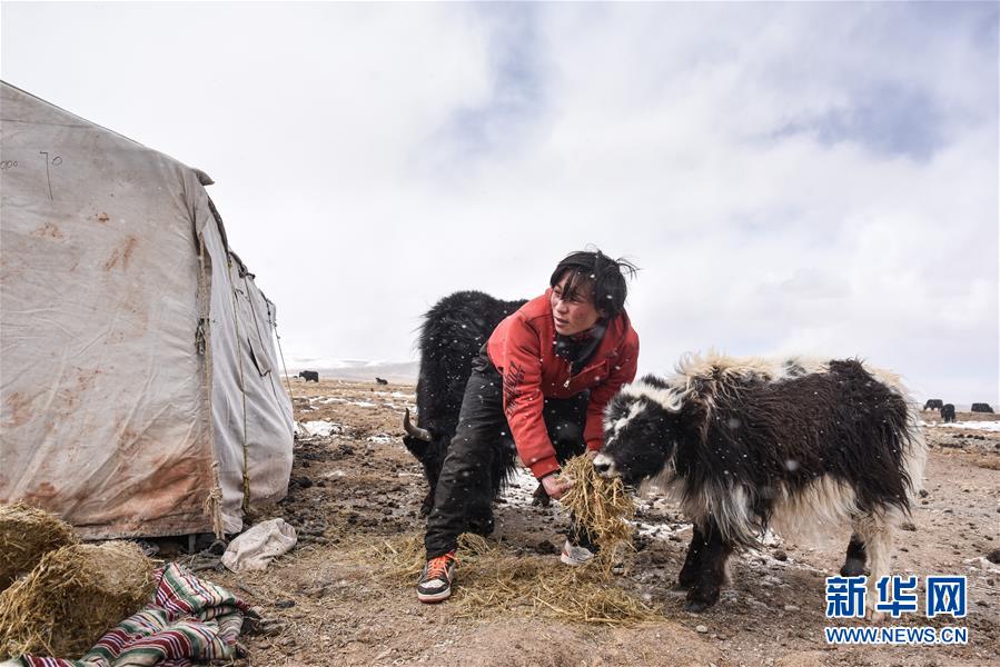 2月22日,才巴拉加在麦雄滩的帐篷前给牛犊喂饲料。今年年初,青海省玉树藏族自治州遭遇重度雪灾,部分地区积雪深度超过半米,牲畜觅食困难,饿死冻死超2万头只。麦雄滩位于巴颜喀拉山脚下的玉树藏族自治州称多县清水河镇文措村,是此次玉树雪灾中化雪较快、接纳受灾转场外地牧民最多的地点之一。文措村党支部书记白尕召集村民开会,大家一致同意拿出30万亩草场,供受灾更严重的其他地区牧民使用。新华社记者吴刚摄