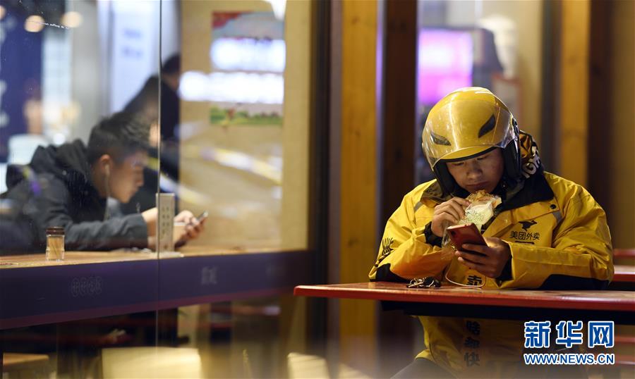 1月27日晚,送餐的间隙,来自湖南岳阳的“外卖小哥”丁鸿在一家餐厅外一边啃面包一边看手机。临近春节,万家团圆,而城市里的外卖配送员仍然骑行在街头巷尾,将美食和春节祝福一起准时送达。新华社记者李尕摄