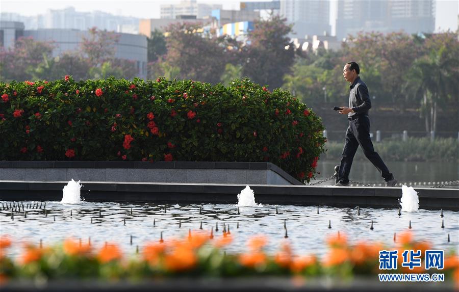12月17日,市民从南宁市南湖边绿树鲜花间走过。 新华社记者 陆波岸 摄
