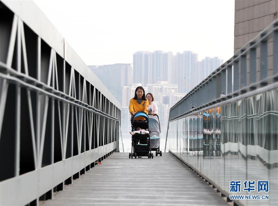 在澳门科学馆附近,两名女士推着婴儿车过桥(12月17日拍摄)。新华社记者李钢摄