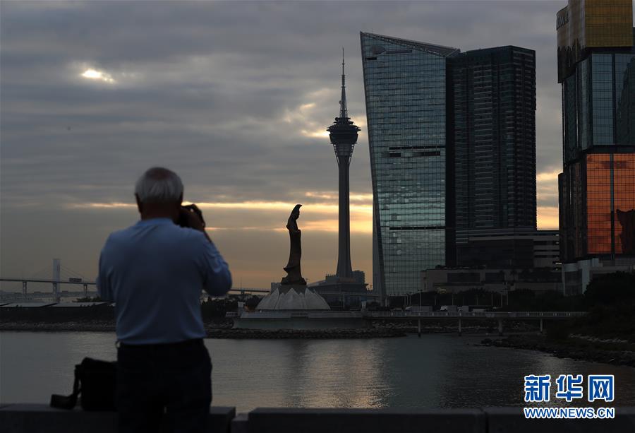落日时分,一名男子在澳门海边拍摄照片(12月17日拍摄)。新华社记者李钢摄