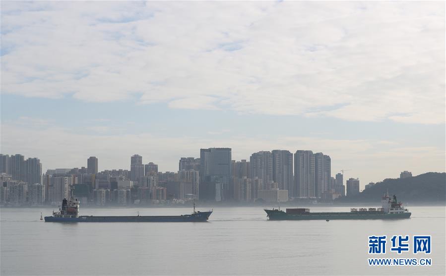 在澳门友谊大桥附近海域,两艘船相向而行(12月17日拍摄)。新华社记者李钢摄