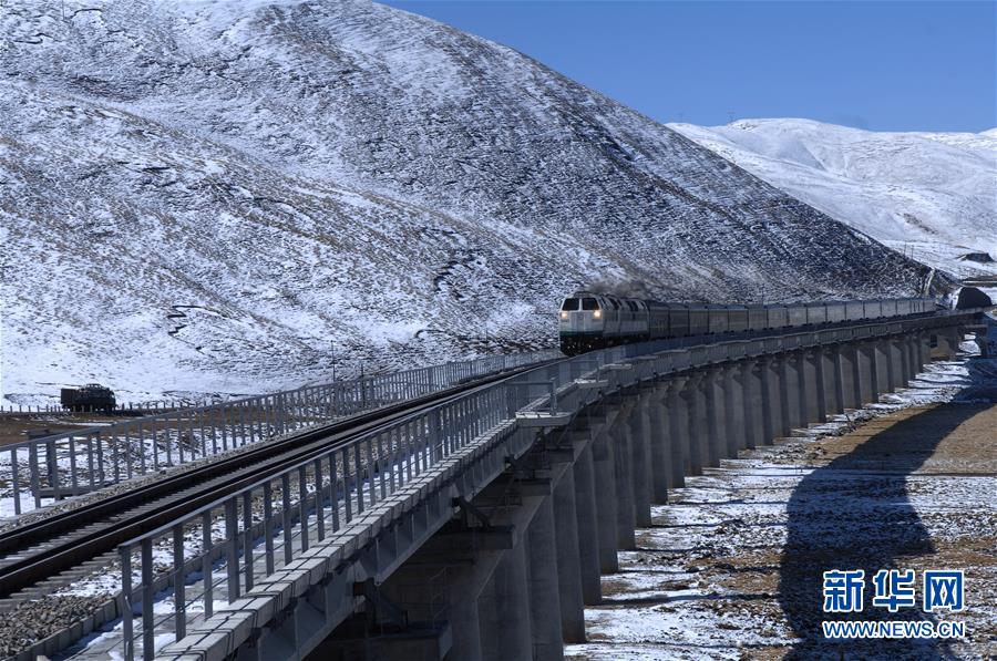 列车行驶在雪域高原的青藏铁路上(2006年10月25日摄)。新华社记者觉果摄