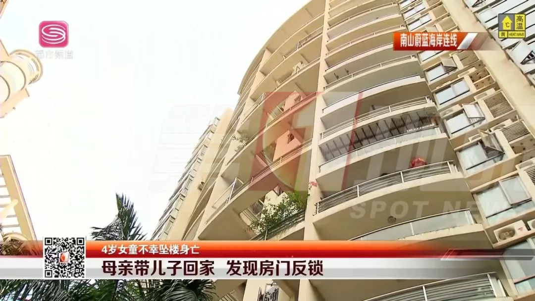 2019年7月26日凌晨,深圳市南山区蔚蓝海岸3期,一名4岁女童被母亲独自留在家中,从15楼高坠后身亡。据知情人士透露,女童家人以为孩子已熟睡,便出门买夜宵。但没成想,孩子在家人买饭途中醒来,在找寻家人的过程中,不慎从阳台跌落。