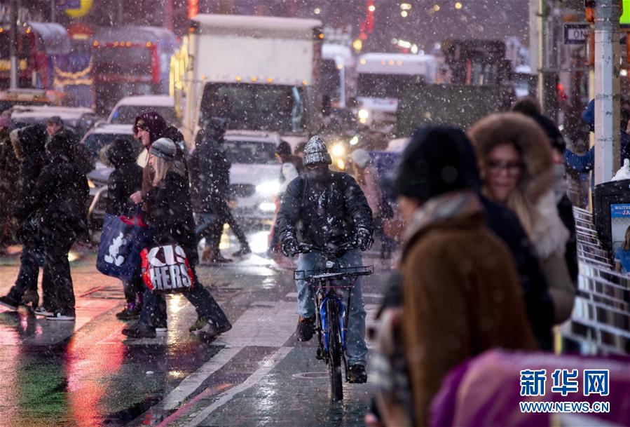 12月18日,在美国纽约时报广场,一名男子冒雪骑行。