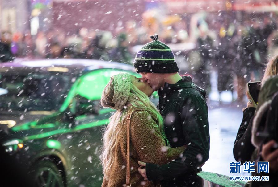 12月18日,在美国纽约时报广场,一对情侣在雪中拥吻。新华社记者 王迎 摄