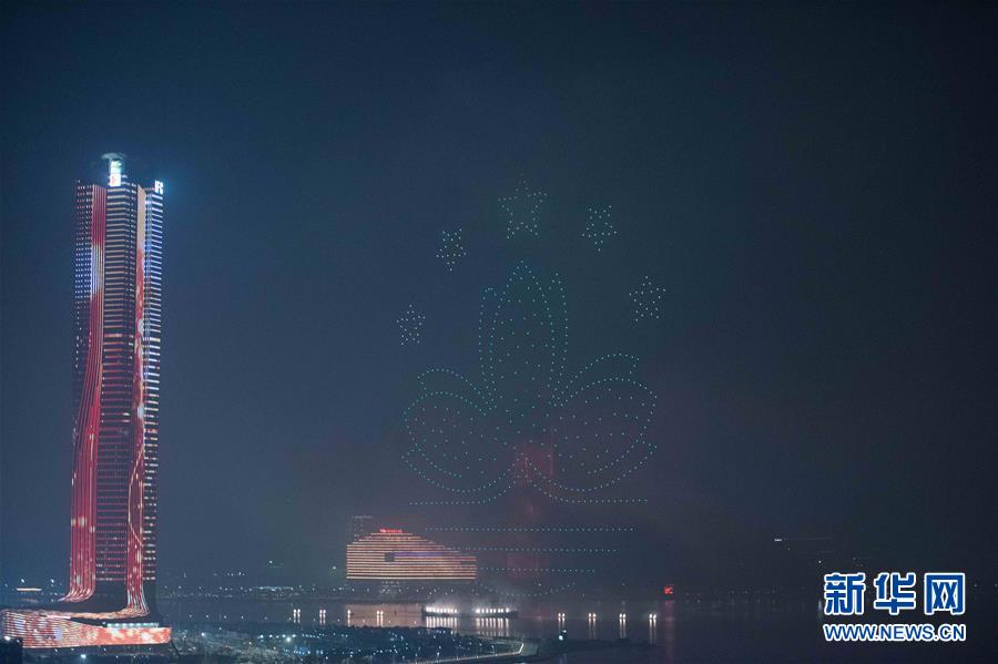 12月22日拍摄的烟花汇演上的无人机表演。当晚,澳门与珠海首次联合举行烟花汇演,庆祝澳门回归祖国20周年。新华社记者张金加摄