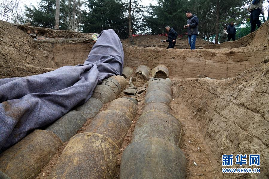 12月21日拍摄的琅琊台遗址考古发掘现场。三组整齐的陶制管道规整排列,管道较粗,管壁较厚,陶水管为两端大小各异的标准件,与现代城市地下排水管件类似。新华社记者李紫恒摄