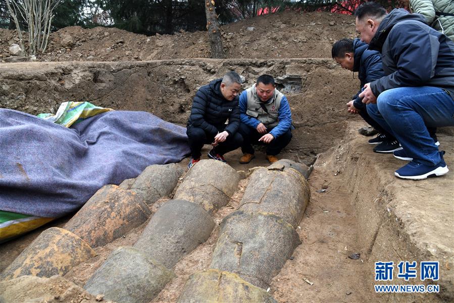 考古队员(左二)在琅琊台遗址考古发掘现场介绍陶水管的构造和结构(12月21日摄)。新华社记者李紫恒摄