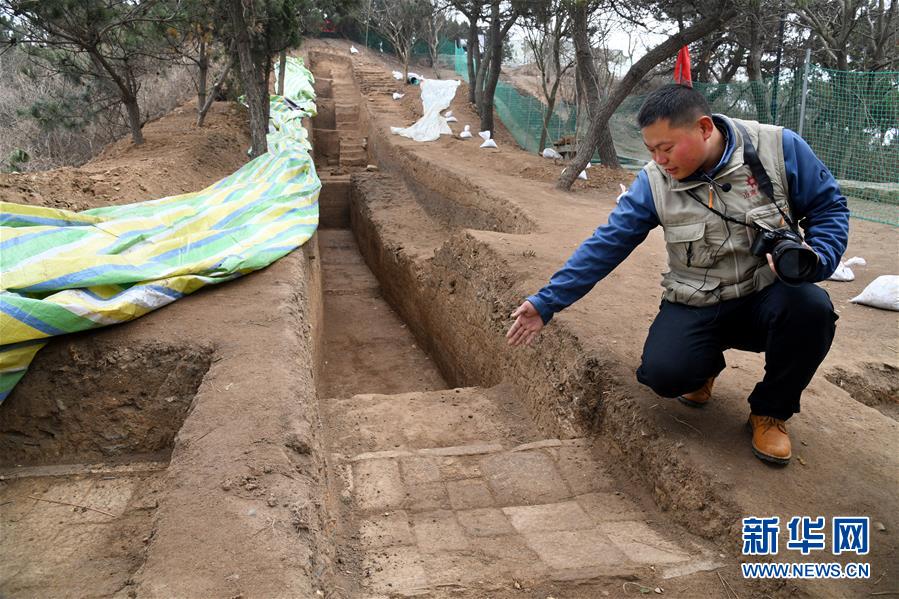 考古队员在琅琊台遗址考古发掘现场介绍发掘出的秦汉时期的石砌道路(12月21日摄)。新华社记者李紫恒摄