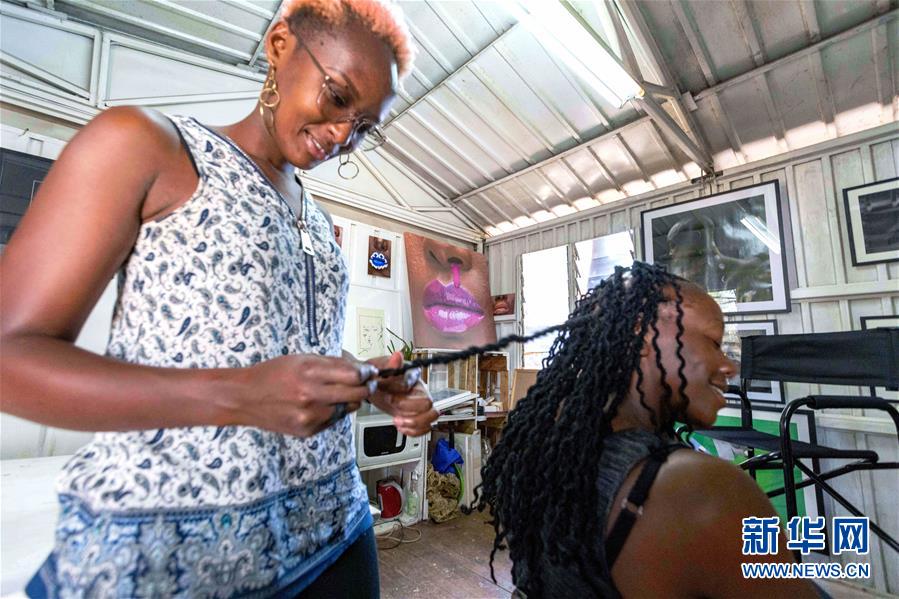 12月20日,在肯尼亚内罗毕库奥纳艺术中心,一名艺术家为游客编辫子。 新华社记者 王腾 摄