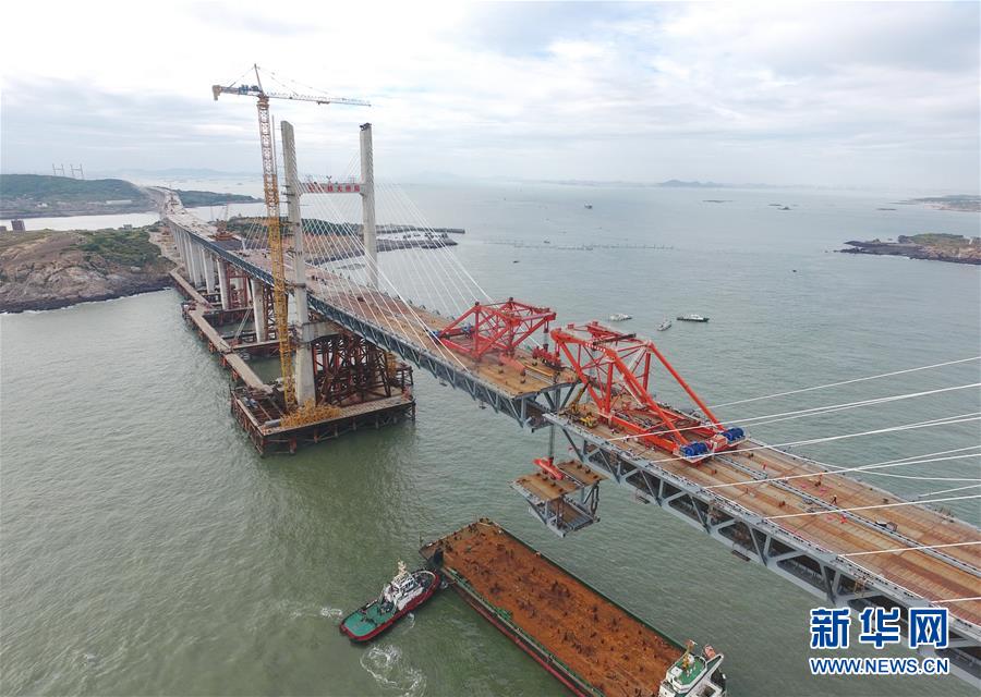 9月21日,平潭海峡公铁大桥鼓屿门航道桥的钢桁梁在吊装中(无人机拍摄)。9月25日上午,随着一段长17米、重473吨的钢桁梁被精确固定到位,总长16.34公里的平潭海峡公铁大桥合龙贯通。平潭海峡公铁大桥是福州至平潭铁路控制性工程,也是“十三五”规划中北京至台湾高铁的先期工程。大桥起于福州市长乐区,“踏”过四座小岛后抵达中国第五大岛平潭,上层设计为时速100公里的六车道高速公路,下层为设计时速200公里的高铁。据福建福平铁路公司介绍,大桥计划2020年正式通车。在六年建设过程中,平潭海峡公铁大桥所应用研发的多项技术、装备创下国内外纪录。新华社记者林善传摄