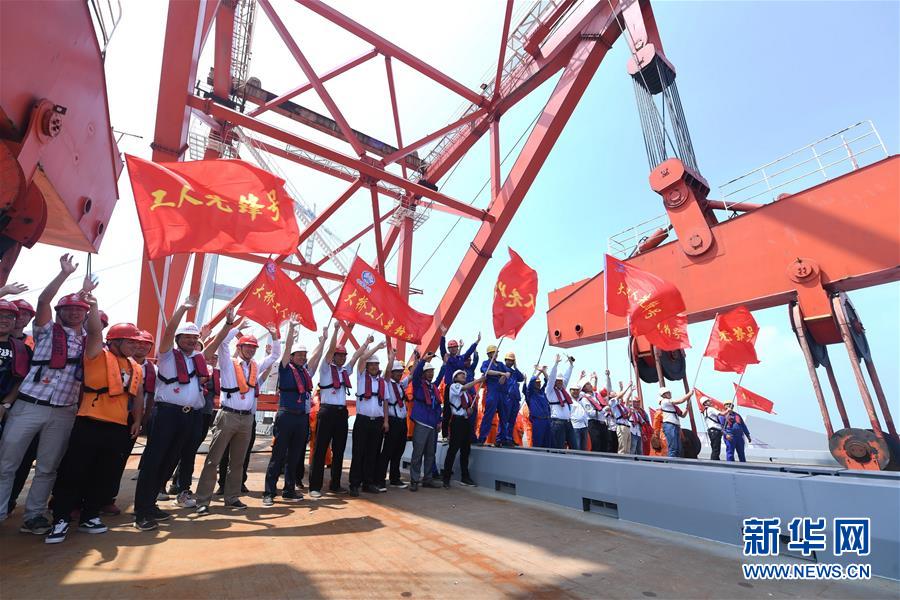 6月5日,福平铁路平潭海峡公铁两用大桥的工作人员庆祝元洪航道桥主桥成功合龙。新华社记者林善传摄