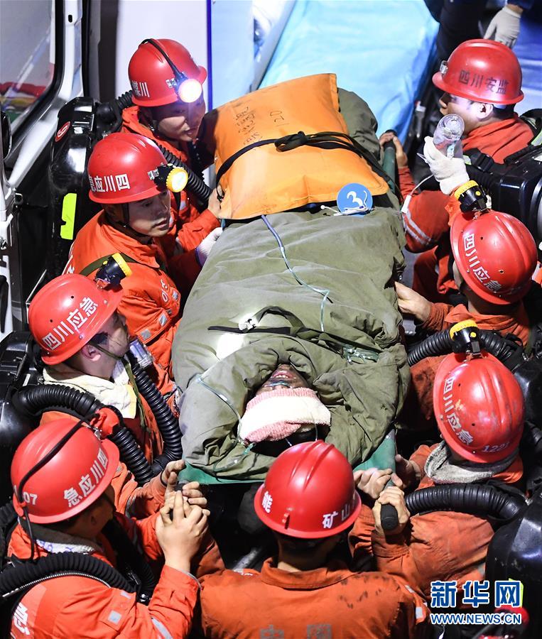 12月18日,救援人员转运安全升井的被困人员。 当日7时56分,经过80多个小时的紧张救援,发生透水事故的川煤集团杉木树煤矿13名被困人员全部安全升井。 新华社记者 薛玉斌 摄