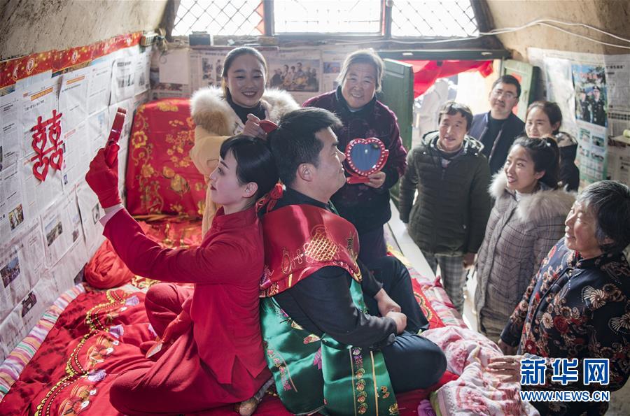 12月18日,在志丹县金丁镇谢湾村举行的一场陕北婚俗表演中,乡亲们为“新人”梳理。这是婚俗中的“并头”环节。