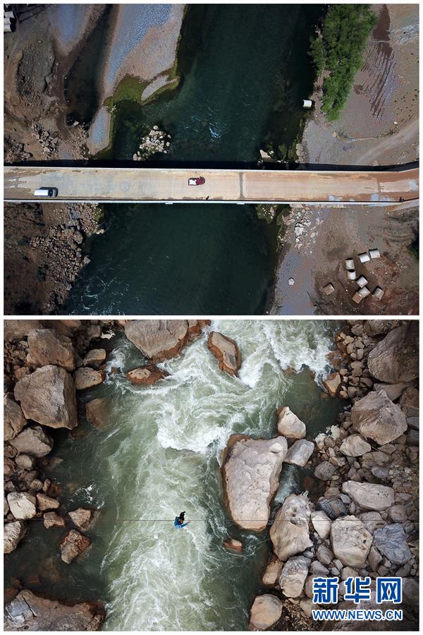 拼版照片:上图为贵州省威宁县海拉镇海元村“溜索改桥”后的场景(2018年3月12日无人机拍摄);下图为贵州省威宁县海拉镇花果村的村民利用尚未拆除的溜索过江(2018年3月12日无人机拍摄)。