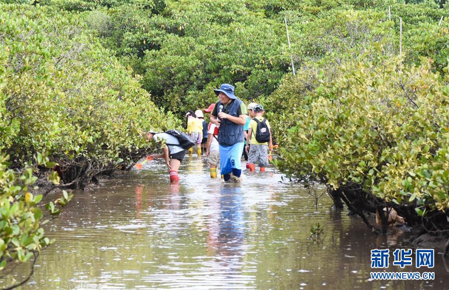 海南东寨港国家级自然保护区林业工程师冯尔辉(前)在保护区内为学生进行讲解(7月16日摄)。 冯尔辉2009年大学毕业后来到保护区工作,小时候他家就住在红树林边上,他从小和红树林打交道,喜欢动植物和鸟类。外贸专业毕业的他边工作边学习,目前主要从事鸟类监测、红树林保育、自然教育等工作。“红树林看着我长大”,冯尔辉说,湿地保护的工作非常有意义。 新华社发