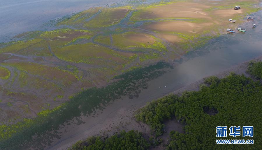 海南儋州新英湾红树林市级自然保护区的红树林和滩涂(12月10日无人机拍摄)。新华社记者杨冠宇摄